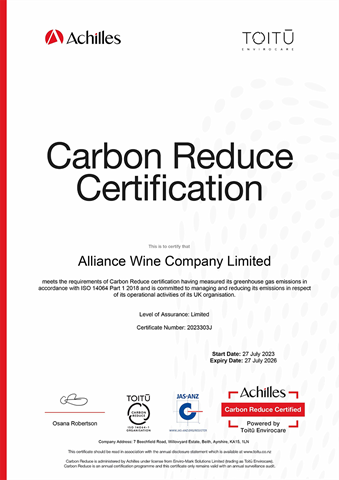 In our continued effort as part of our sustainability strategy, Alliance Wine is delighted to announce that we have achieved Carbon Reduce Certification: ISO 14064 part 1 certification. This means that we now meet the requirements of Carbon Reduce Certification having measured our greenhouse gas (GHG) emissions in accordance with ISO 14064-1, and have proved we are committed to managing and reducing our emissions in respect of our operational activities in the UK. It includes requirements for the design, development, management, reporting and verification of an organization's GHG inventory.
